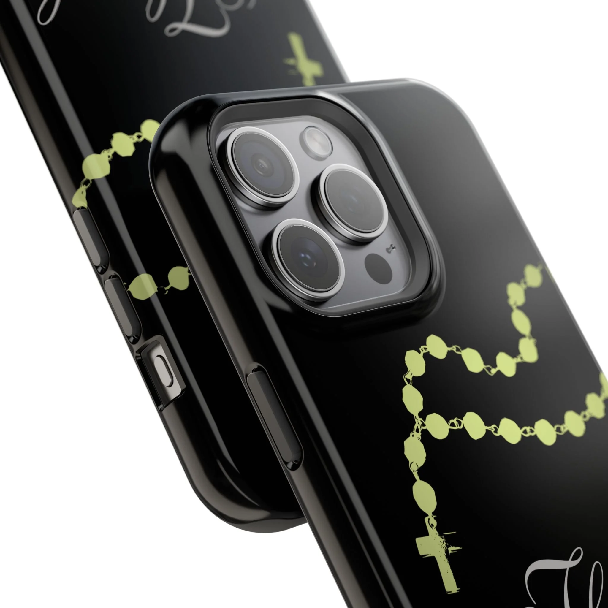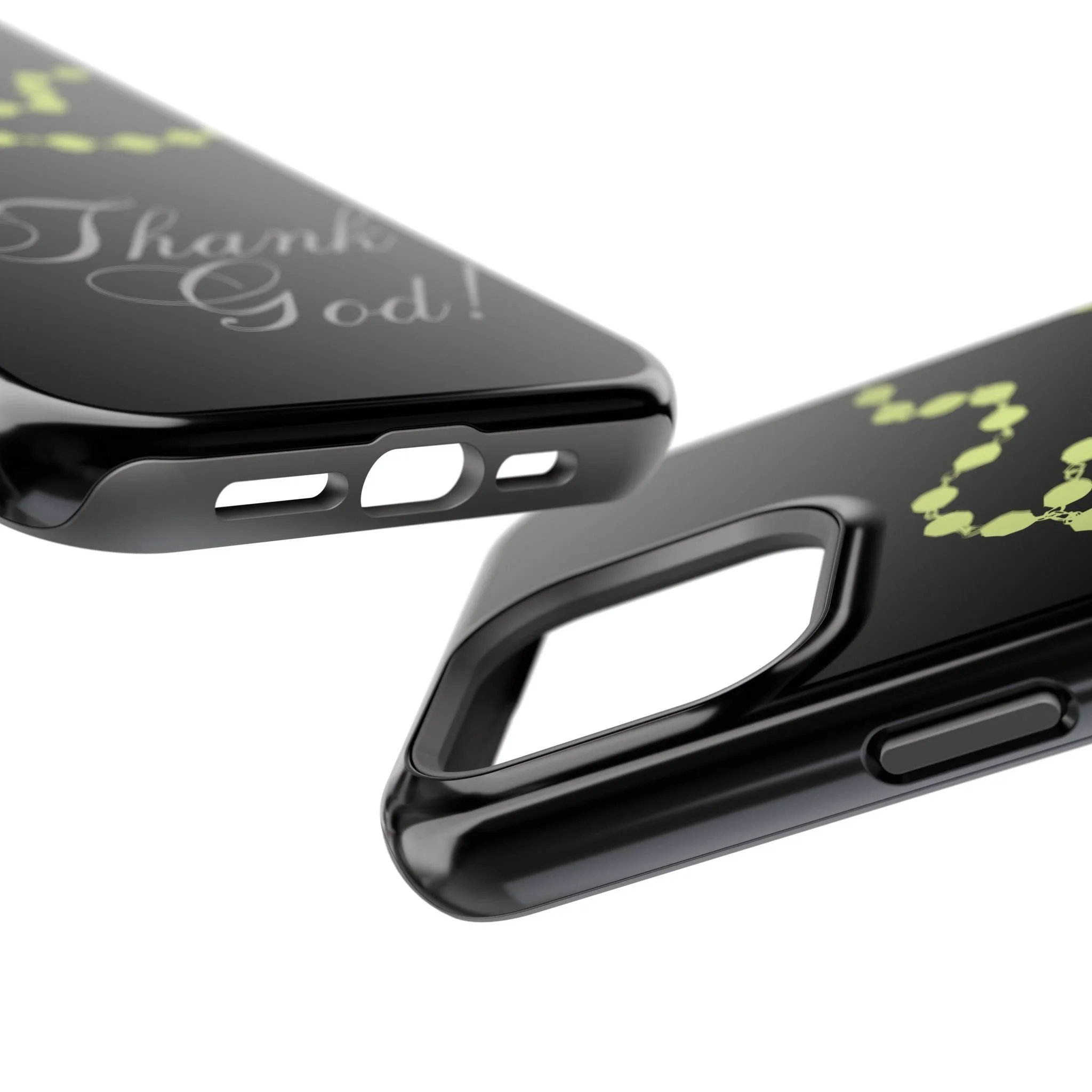 Personalize your phone with this case! "Thank God!?" written in neon caligraphy with a little black lace on the bottom.